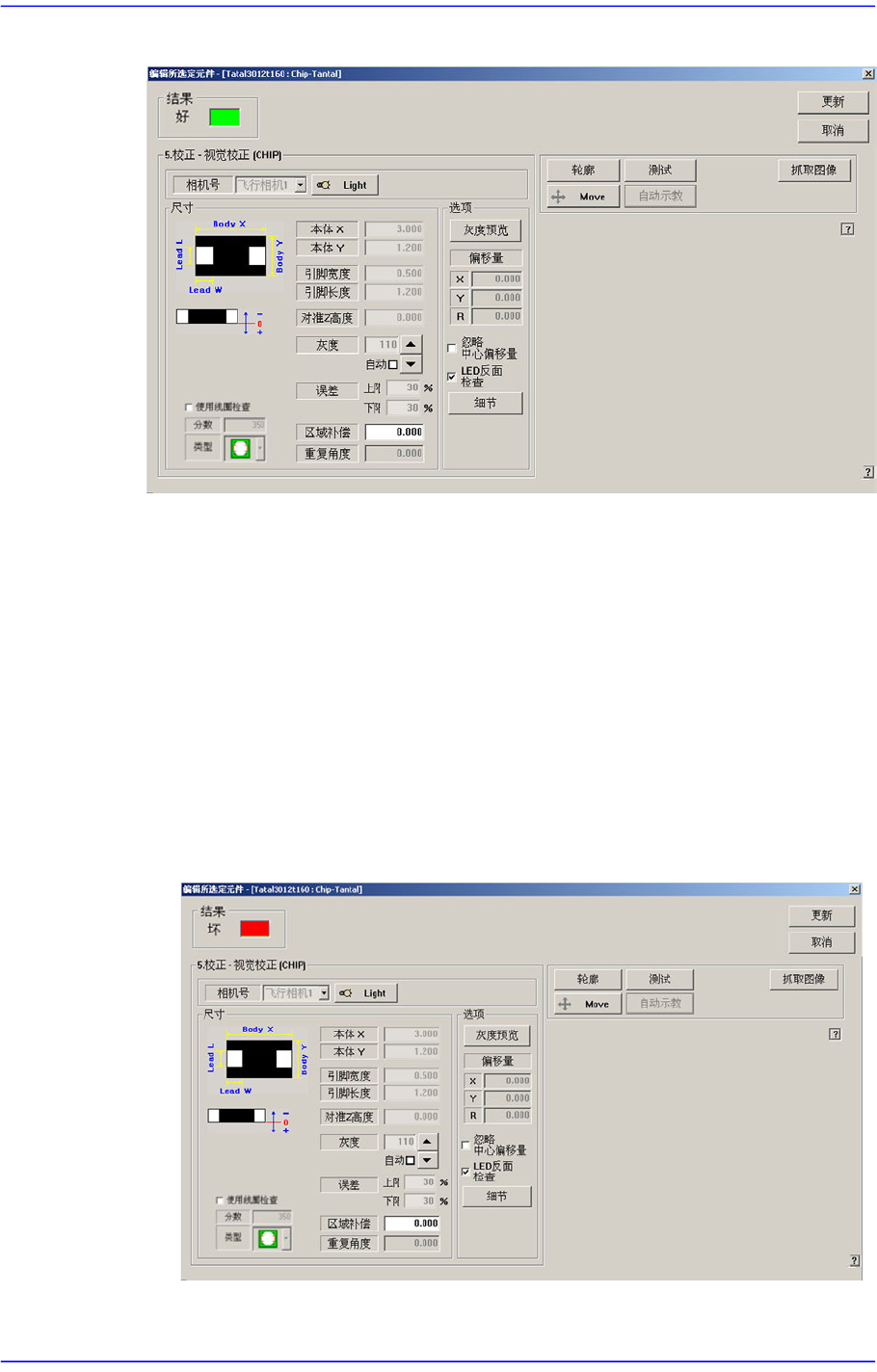利用已设定的排列数据测试部品的识别动作。成功地完成测试后显示如下的信