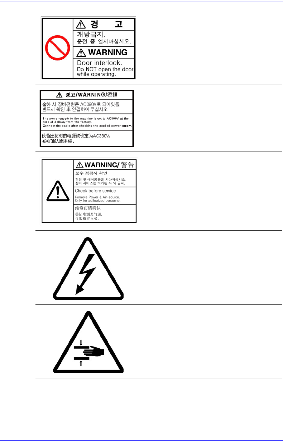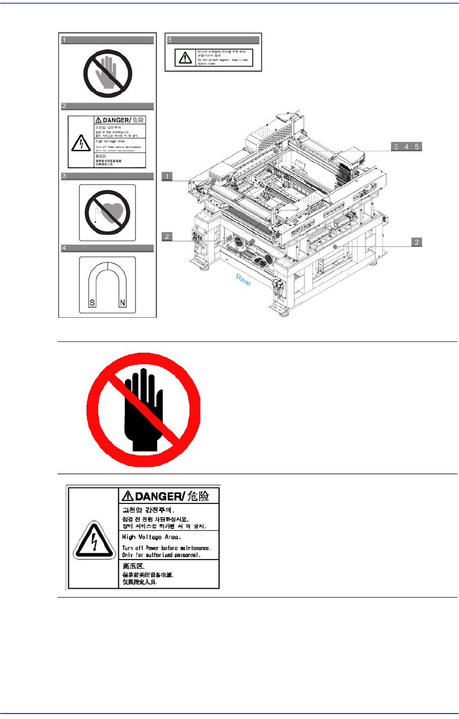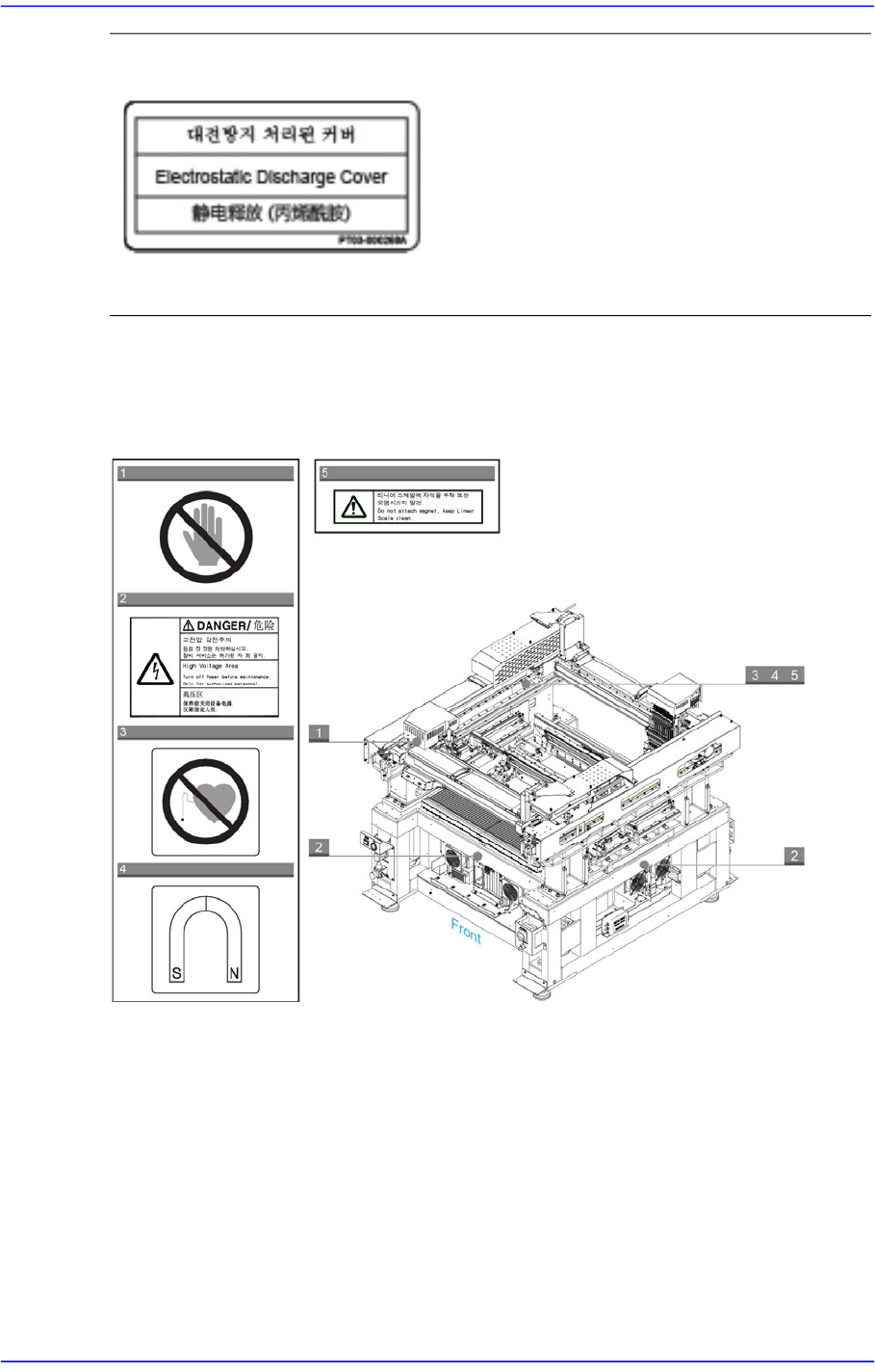 前言 vii 设备内部 设备内部贴有以下标签 图 1.3 贴附在设备正面内部的安全标签 请小心清理 Cover 。 使用干净的超细纱布沾取指定的清洗液轻柔 擦拭 Door 的亚克力 Cover 。 如下行为可能会引起带电防止 Cover 受损, 请注意。 利用碳酸氢、 酸 性、 强碱性、 酯、 酮 或相 似成分清扫 利用超细纱布用力擦拭压克力盖