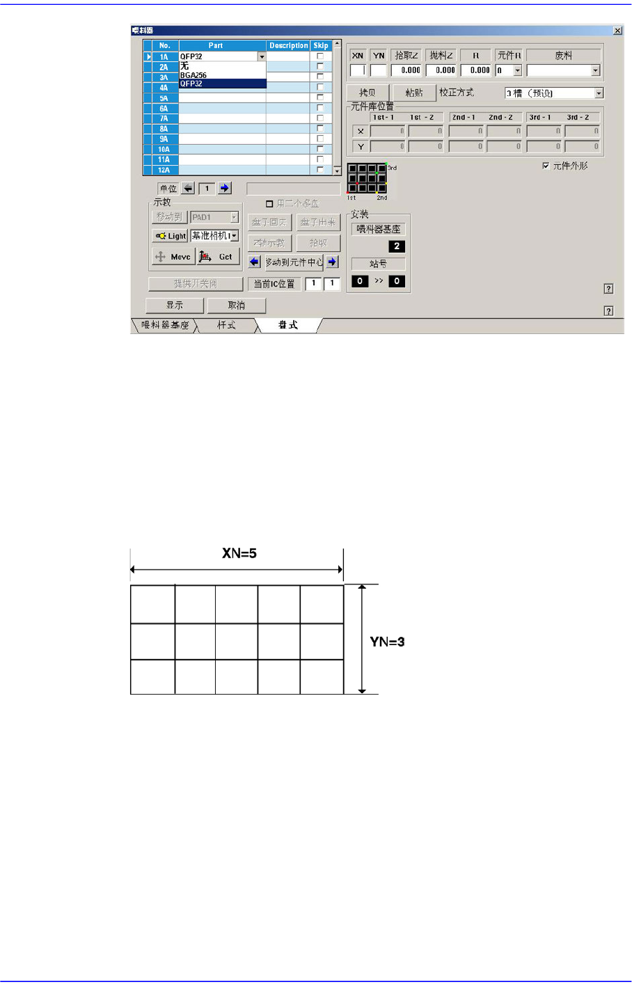 8-20 Advanced Chip Shooter DECAN S2 Admin i s trator’s Guide <SK> 列 相应的 T r ay 已设置 T ray Feeder 时, 选择从 T ray Feeder 供给的部 件吸附与 否。 <XN> 编辑框 设定排列在多盘式上的部品的 X 轴方 向的数量。 <YN> 编辑框 设定排列在多盘式上的部品的 Y 轴方 向的数量。…