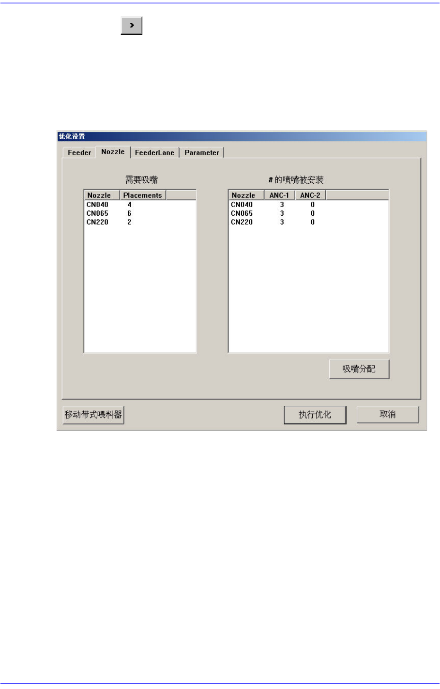 10-3 Opti m ization 箭头按钮 ( ) 从已配置的喂料器设定变更到要经 优化配置的喂料器设定。 10.2. Nozzle 图 10.2 " 优化设置 : 吸嘴 " 对话框 显示吸嘴配置有关信息的画面。 < 需要 吸嘴 > 目录箱 在此目录框表示部件的贴装所必要的喷嘴种类及各喷嘴的使用次数。 <Nozzle> 栏 表示喷嘴名称。 <Placements&g…