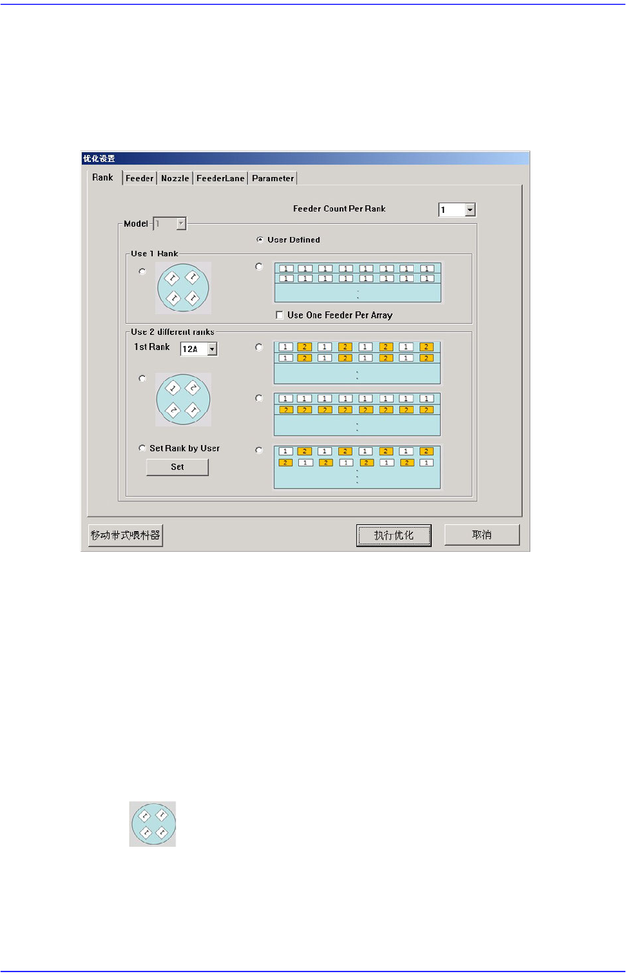 12-12 Advanced Chip Shooter DECAN S2 Administrator’s G ui de 如果是利用棒 (Bar) 型照明板对同一等级的 LED 进行作 业则予以选择。 <Bar -F eeder Ma t ching> 检查框 如果棒 (Bar) 型照明 板需要使用一个供料器对一个整体生产线的贴装点供应 元器件, 则 圈选该复选框。 <Use 2 Rank> 领域 该…