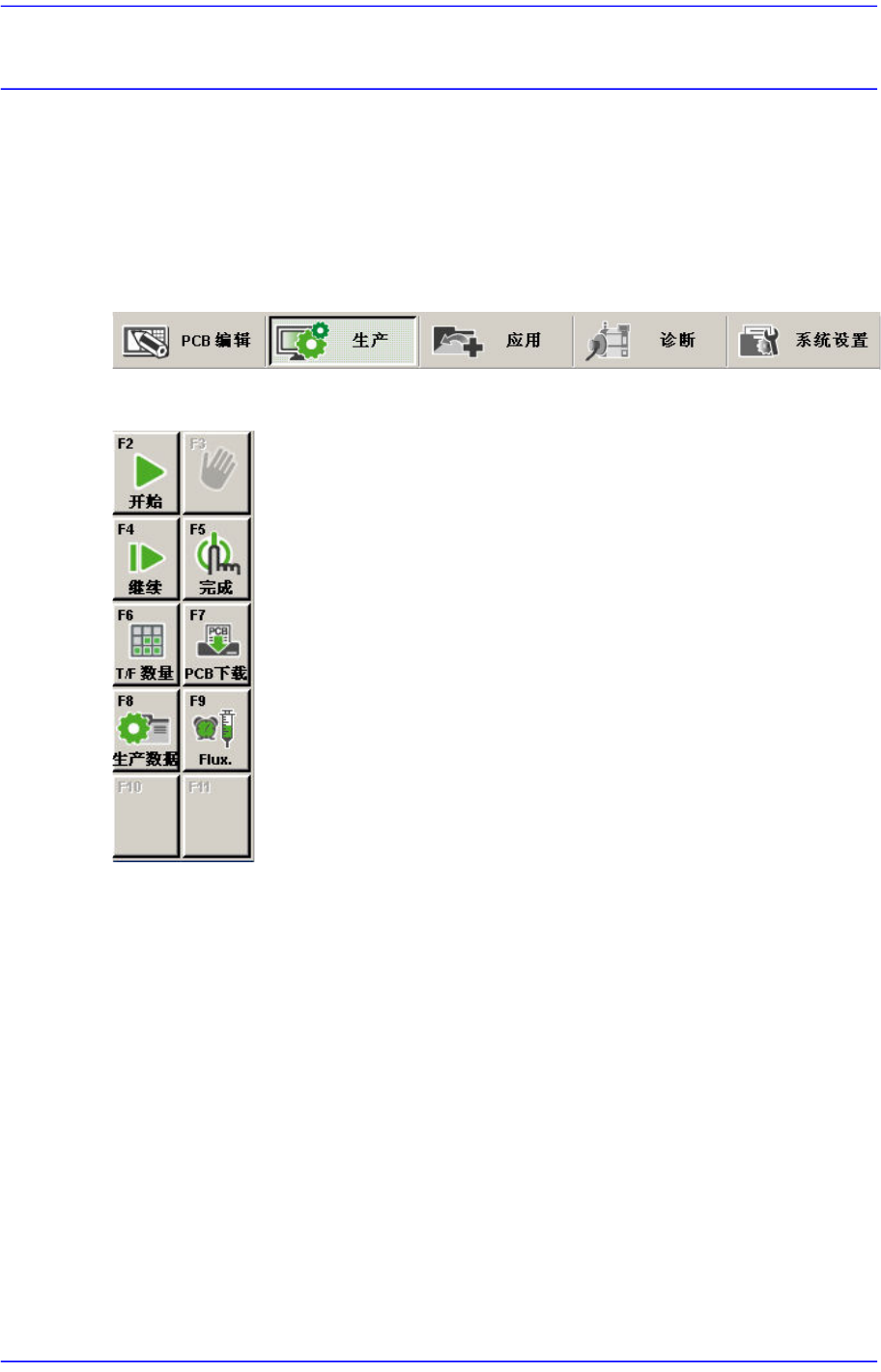‘生产’菜单由 开始, 停止, 继续生产, 完成, T/F 数量, PCB 下载, 生产数据 等7个子