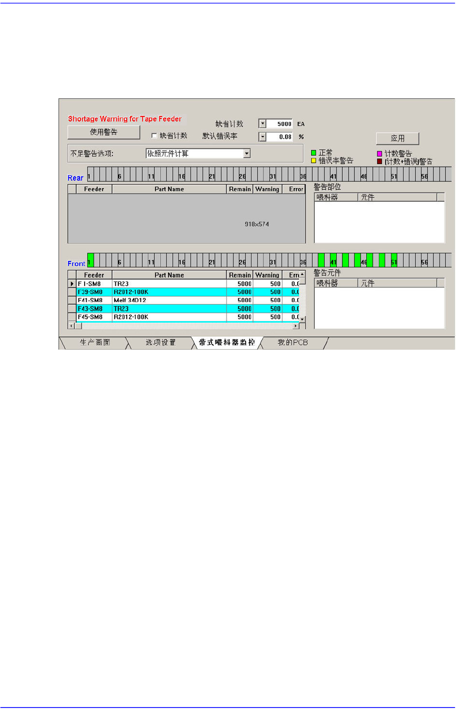 显示已贴装Tape Feeder的部件剩余量,可设置警告部件不足的部件剩余量,监控与