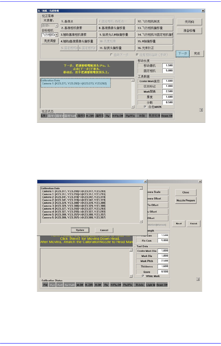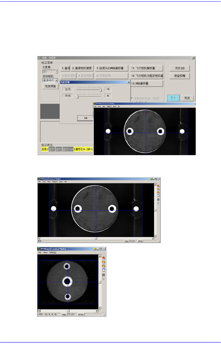 14-61 Machine Calibration 7. 那么, 磁 头 1 上升到飞 行相机的 Align 高度, 关闭 Mirror 。 然后在消息窗显示 ” 准 备标准。 8. 对于标准, 点击 [ 下一 步 ].” 消息。 此时在 < 目标摄像 > 组合框中选择 ” 飞行相机 1” 点击 < 亮度 > 按钮, 在 ” 亮度 控制 ” 对话框中 S MV ison 显示的 Calibration T oo …