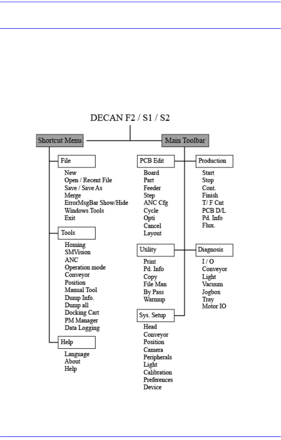 2-1 MMI 的菜单结构 第 2 章 . MMI 的菜单结构 本章简略介绍有关本设备操作应用程序 MMI 的菜单构造和各菜单的功能。 对于各菜 单的详细说明请参考 “ 第 6 章 . Boar d 定义 ” ~ “ 第 16 章 . 生产信息管理 ” 的内容。 2.1. 人机界面 ( Man-Machine Interface ) MMI 2.1.1. 菜单结构图 图 2.1 MMI 的菜单结构图
