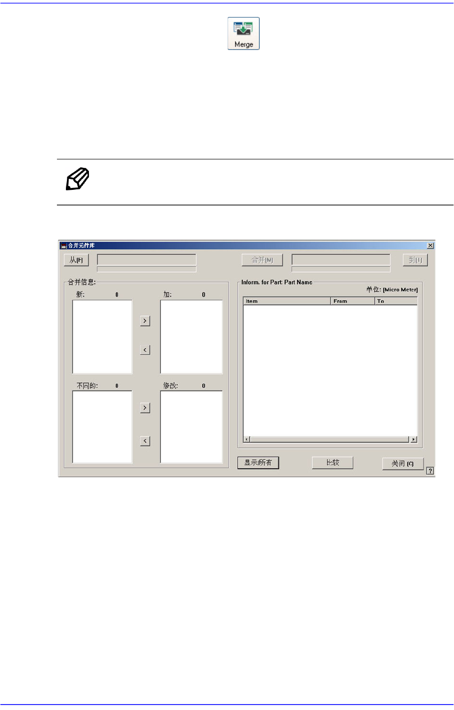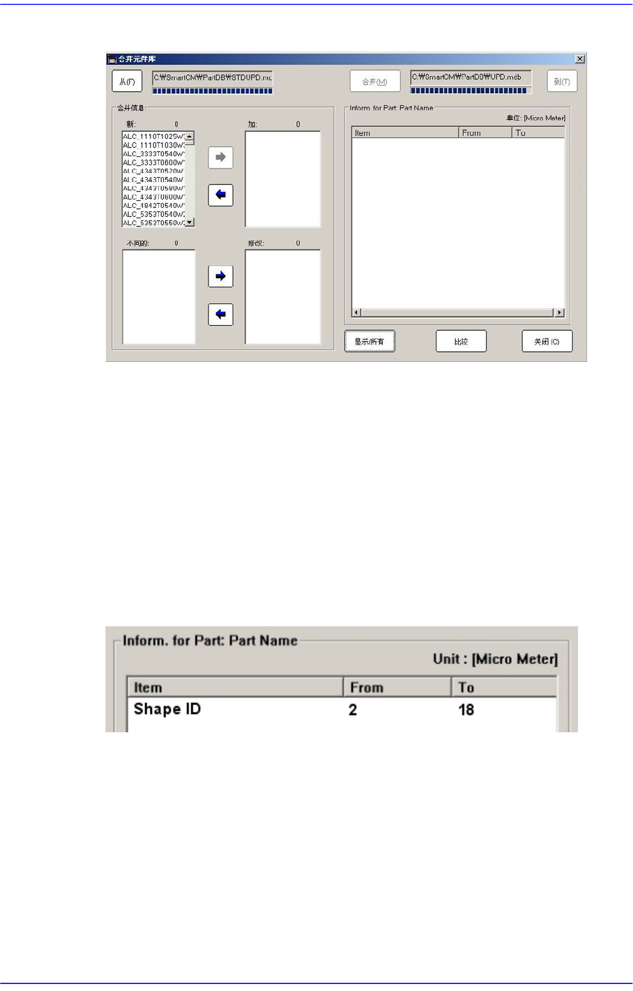 <在〈新:〉目录框或〈不同的:〉目录框选择要合并到Target DB文件的部件信息