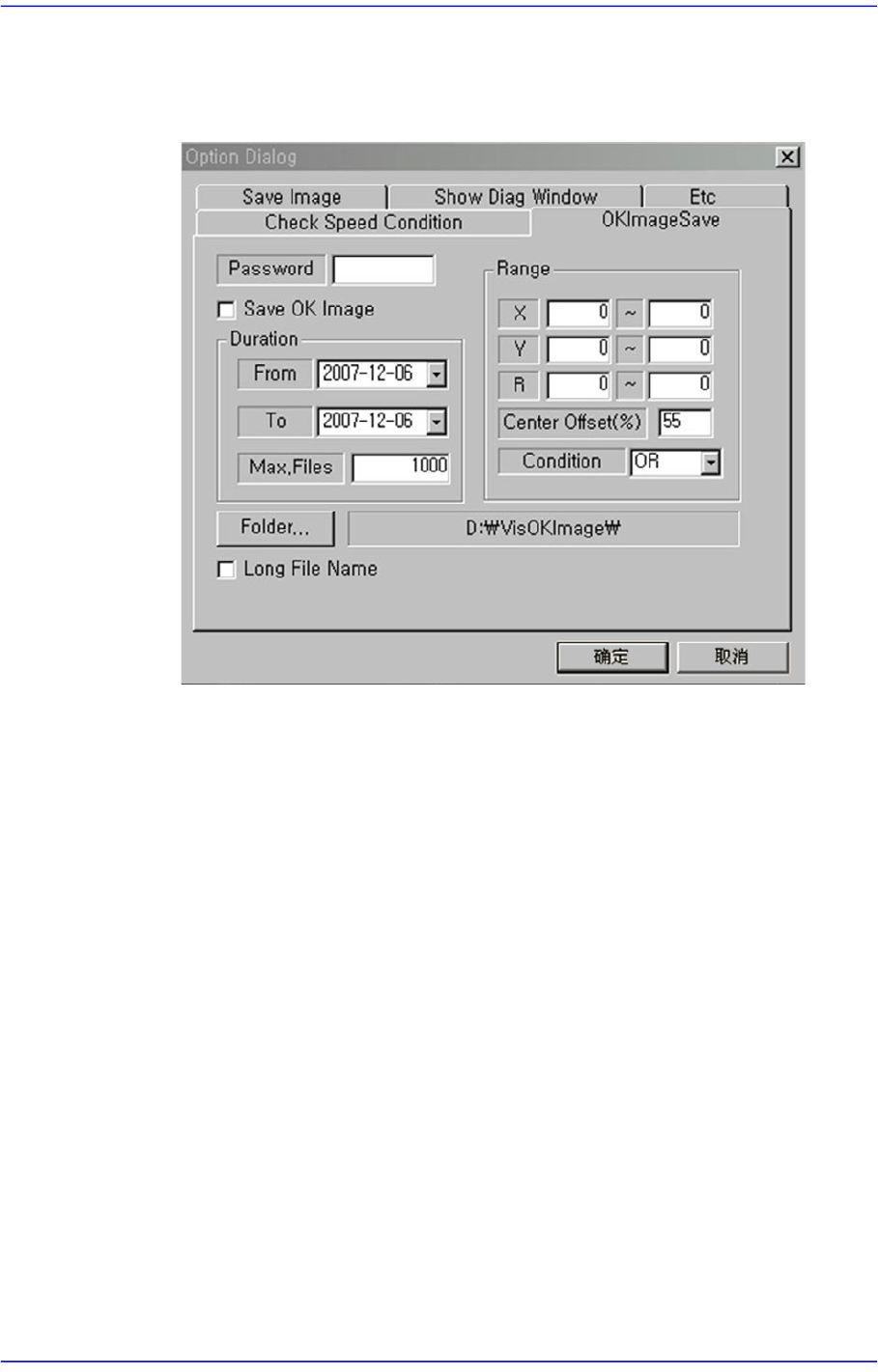 4-7 Tools 简化操作 (shortcut) 菜单 OKImageSave 这是可保存一定范围内的错误和一定期间内错误的功能。 最大保存可能个数 为 5000 个。 Zoom T oolbar… 隐藏或显示 Zoom T oolb ar 。 4.2.1.5. 显示窗 显示摄象机的实际影象, gra bbed 影象, bitmap 形象 等 。 4.2.1.6. 状态栏 输出画面扩大比率。