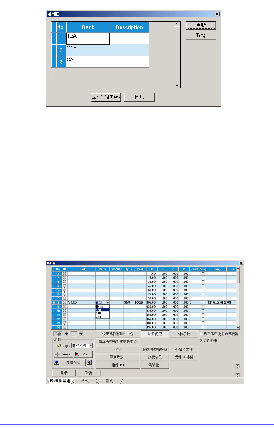 12-7 LED 贴装作业 <Insert Rank> 按钮 为了添加 Rank 而增 加画面的 Grid 。 < 删除 > 按钮 删除选定 Rank 。 < 更新 > 按钮 可以储存修改后的 Rank 信息 并关闭窗口。 < 取消 > 按钮 不储存修改后的 Rank 信息并关闭窗口。 登记了 Rank 时, 可以如下图所示在 “ 喂料器登 记 ” 对话窗口选择 Rank …