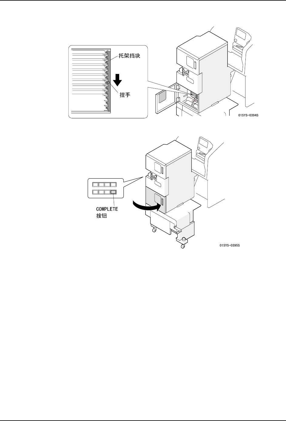 4. 生产 QD142-06 90 NXT II 系统手册 10.请拿住捏手,放下 托架挡块。 11.请关闭正面门 (下层) , 按下 COMPLETE 按钮。 备注 )请轻轻关闭正面门,以免料盘单元 -LTC 受到冲击。