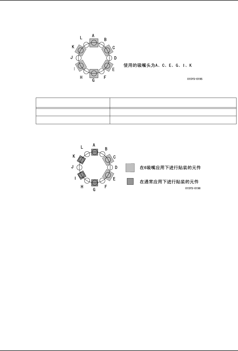 在 6 吸嘴应用中使用的吸嘴头固定为 A、C、E、G、I、K。如果将这些吸嘴头设定成吸嘴头