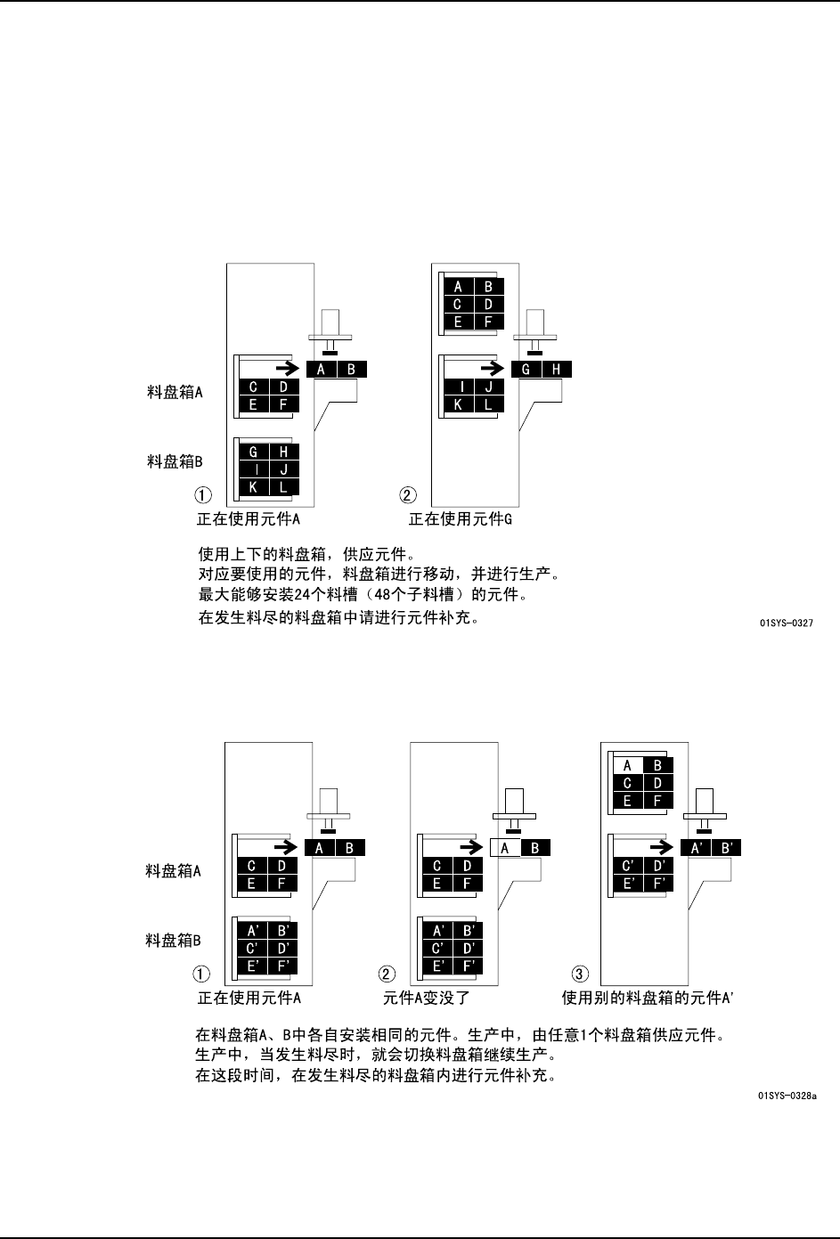 备注 )插图说明了从料盘箱 B 的补充模式。通过辅助软件的机器功能设定,也能够按照从料
