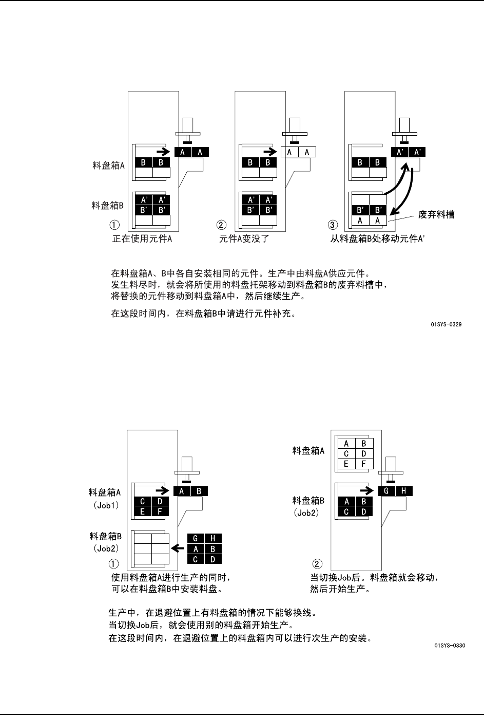 料盘箱 A、B 各自根据 Job 被运用的模式。生产中,在退避侧的料盘箱中进行次生产的准备,