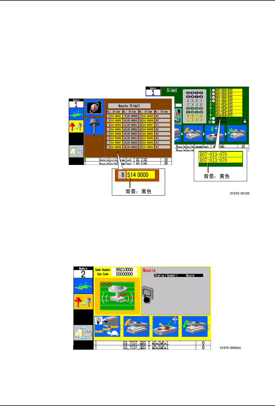 备注 )在手动模式的信息指令及换线时的安装向导中,被切换的吸嘴的代码或别名以黄色的