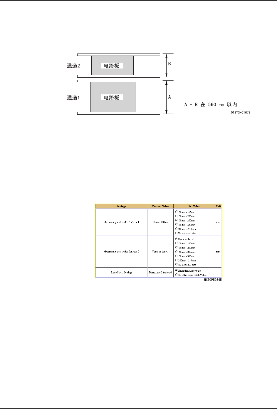 备注 )通道 1 和通道 2 的支撑板尺寸合计必须在 560 mm 以内。能够生产的电路板尺寸也受到