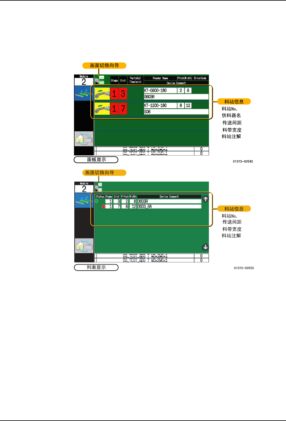 在 [ 列表显示 ] 画面上,能够知道安装更换供料器的场所。按上下键(箭头键),画面就会