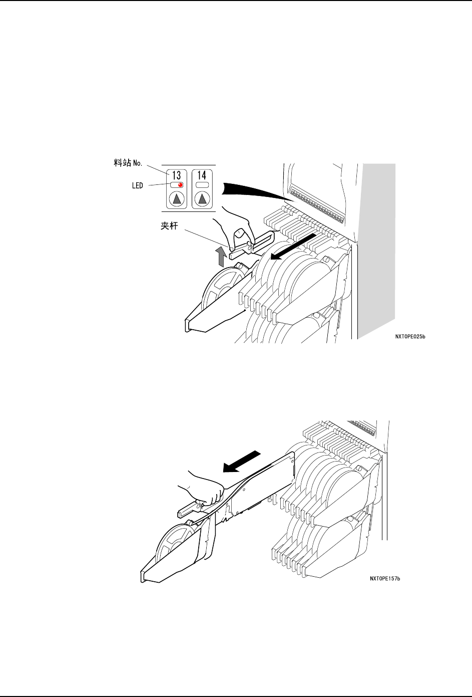 QD142-06 5. 换线 NXT II 系统手册 219 5.4.2 供料器的卸下和安装 使 用 Fujitrax Verifier 时,需 要有 供 料 器 与料 卷 间 的相 关 设 置。详 细 请参 照 Fuj itrax Verifie r 用户手册。 1. 如果安装在前面门上的 LED 点亮 , 则说明该料槽 No. 需要更 换或者检查供料器。 有必要 更换供料器时如下图所示,提起 供料器的夹杆后夹块松开,使供料器 的电源…