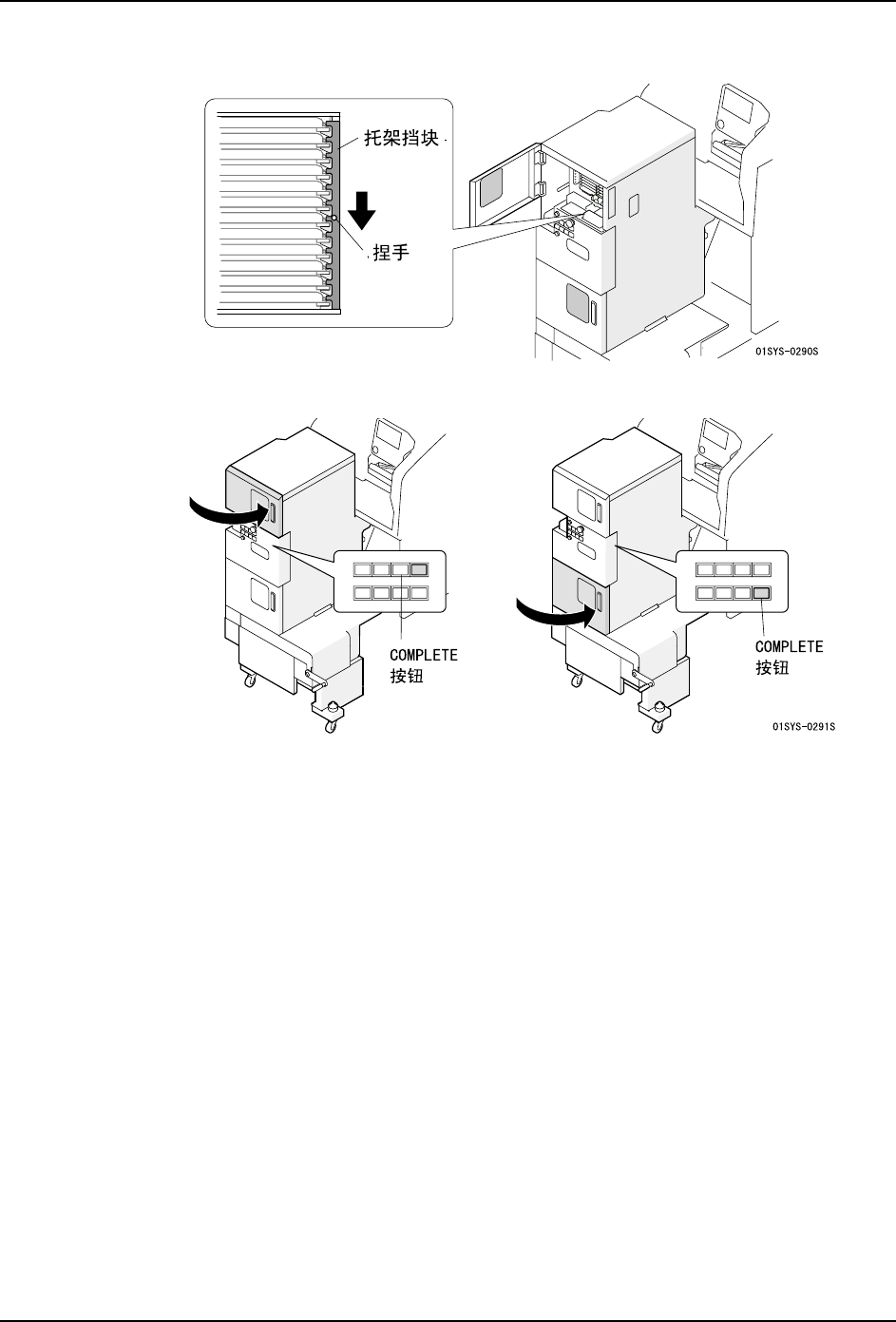 5. 换线 QD142-06 246 NXT II 系统手册 11.请拿住捏手,放下 托架挡块。 12.请关闭正面门,按 下 COMPLETE 按钮。 备注 )请轻轻关闭正面门,使得料盘单元 -LTC 不受到冲击。
