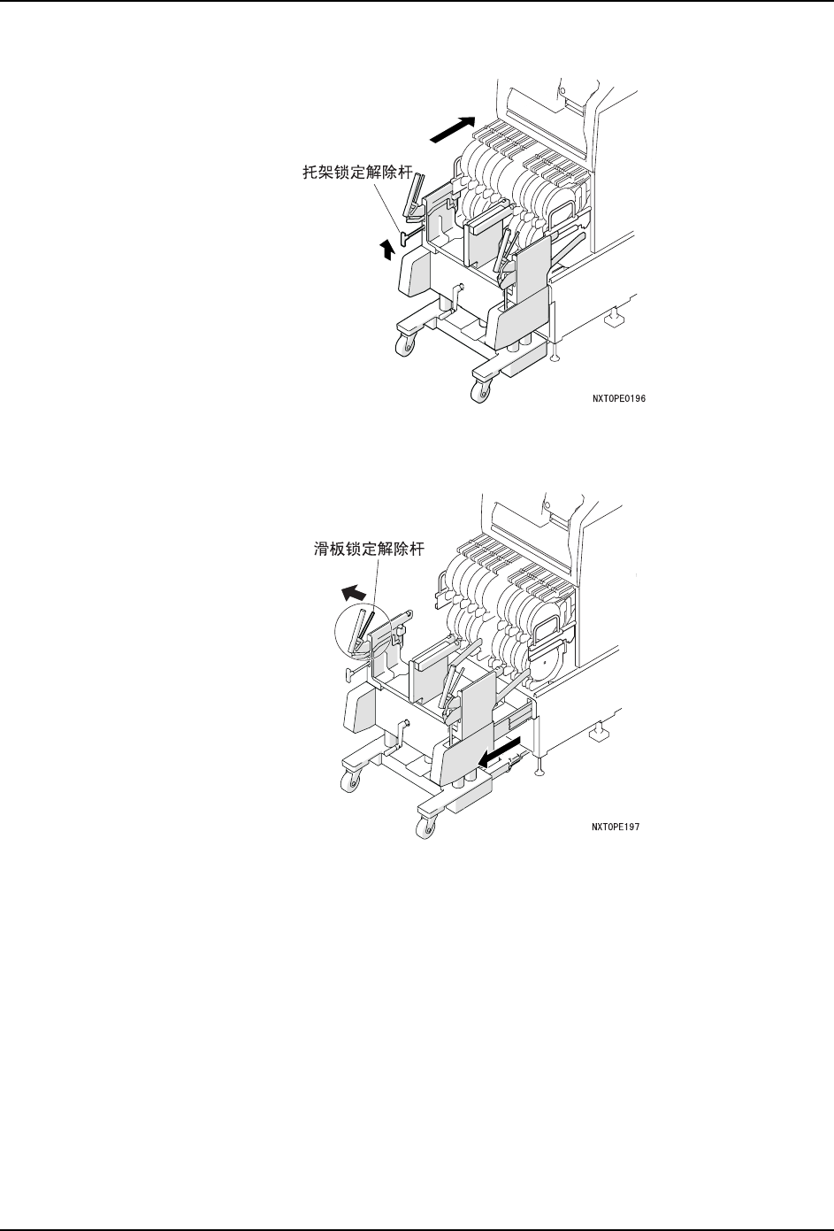 QD142-06 5. 换线 NXT II 系统手册 287 2. 请将 PCU 靠近基座的前面。 请慢慢推 PCU, 将导向臂插入基座的开口部。 当 PCU 被正确插 入时,导向臂就会自动被夹紧。 备注 )根据地面的情况 ,有时导向臂与开口部 的高度部会不一致。 因此, 在插入时一边目视 导向臂的高度一边推入 PCU。当高度不一致时,请旋转手柄进行微调整后插入。 3. 请握住 PCU 滑板锁定解除杆,使 PCU 本体向前方滑动。 备注…