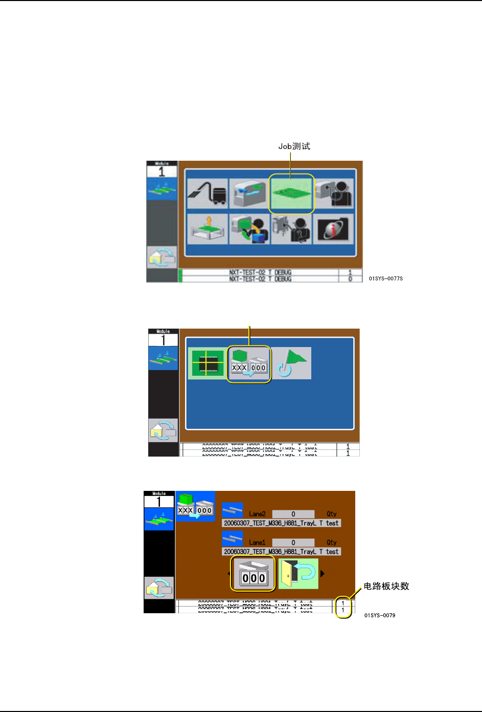 2.当机器识别出搬运轨道内有电路板时,通道的图标被显示成红色。请等待生产结束或