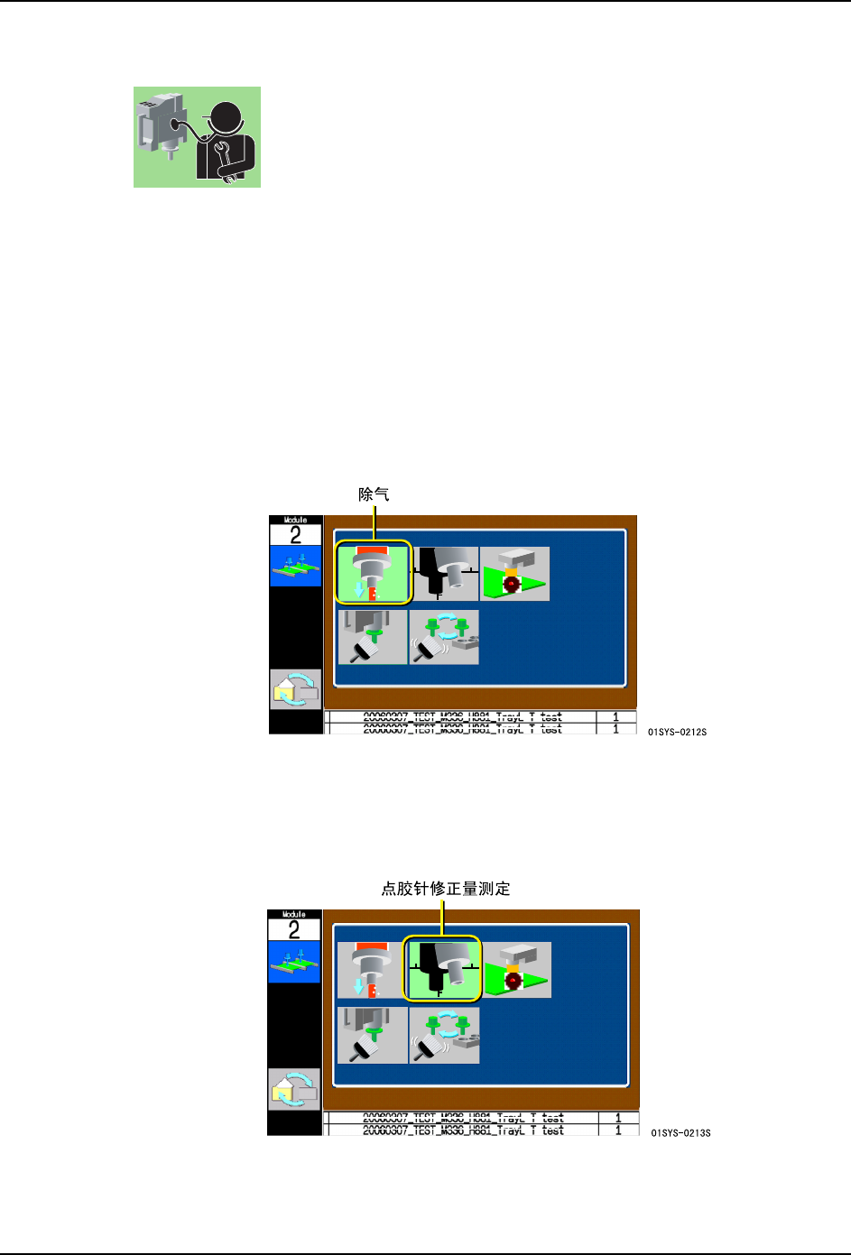 QD142-06 6. 手动模式指令 NXT II 系统手册 321 6.7.3 胶着剂涂敷状态确认 该指令使用在安装了 GL 工作头的模组上。执行该指令,测定涂 敷在胶着剂检查单元上的胶 着剂的面积。测定时,生产 Job 中必须设定了胶着剂检查顺序。 详细的操作方法,请参照 GL 工作头使用说明书。 6.7.4 工作头吸嘴清扫 该指令使用在安装了 GL 工作头的模组上。执行该指令,清扫被 安装在工作头上的吸嘴和热 补正定位点。 详细的…