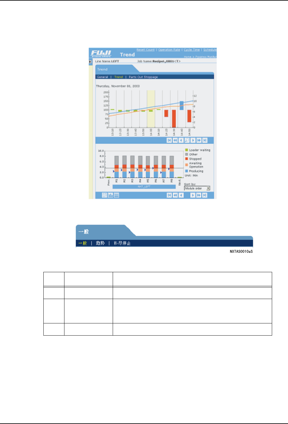 7. 辅助软件 QD142-06 332 NXT II 系统手册 7.5.2 生产信息的详细内容 运转监视器可以确认单击有箭头 的图标的生产线的过去 24 小时的运转状态。在这个画面上 显示 3 种类的信息。 单击 [ 状态 ] 的箭头图标后,显示出所选 择的生产线的 [ 趋势 ] 页面。 用蓝色表示当前选择中的信息标 记。 选择在标题栏下面的深蓝色部分中显示的信息名后, 切 换到该项目的信息页面的显示。 为了确认运转状况可以显示以下 …