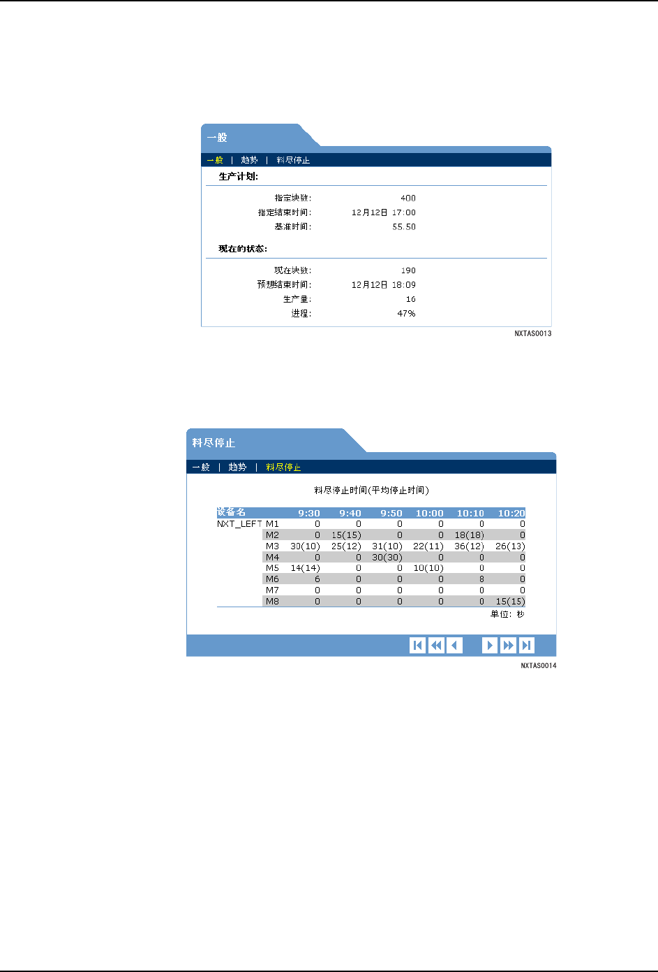 QD142-06 7. 辅助软件 NXT II 系统手册 335 一般信息 在 [ 一般 ] 的页面上,显示有关当前生产中的 Job 信息。在画面上方,显示出预定生产块 数、 生产结束时间以及预定周期时间。 另外, 在画面下方, 显示出电路板生产完成块数 、 预 计结束生产时间、单位生产时间 、以及生产进展状态 (%) 。 料尽停止信息 以一览显示不同模组、 不同时间区间由于料尽而产生的停止时间 。 括号内的数字表示料尽停 止时间 (秒…