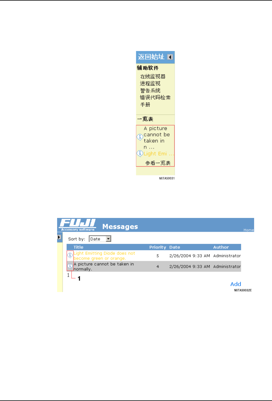 QD142-06 7. 辅助软件 NXT II 系统手册 345 7.7.2 白板的信息编辑 单击要编辑的信息图标后, 显示出选择的 信息,可 以对其内容进行编辑。 单击 [ 删除 ] 后, 删除选择的信息。单击 [ 取消 ] 后,不变更信息内容,结束编辑操作。 7.7.3 在白板上增加信息 单击信息一览表的 [ 增加 ] 后, 可以在白 板上增加信息。 输入信息后, 单击必要的项目的设 定后,单击 [ 应用 ],就会保存信息。