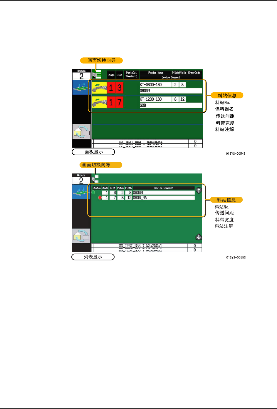 在 [ 列表显示 ] 画面上,能够知道安装更换供料器的场所。按上下键(箭头键),画面就会