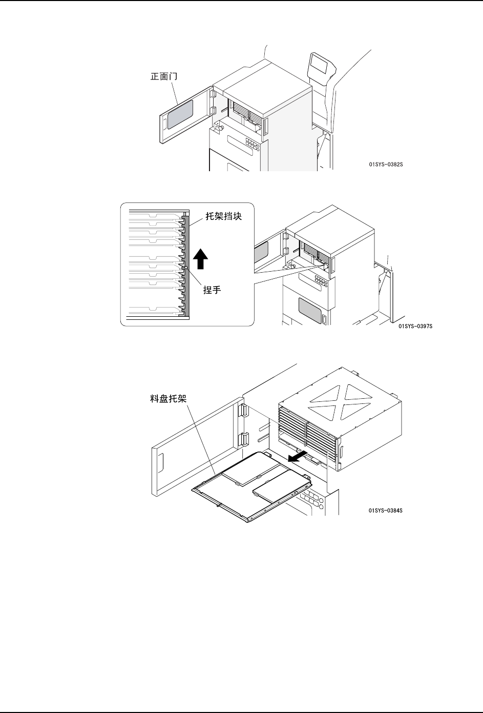QD142-06 4. 生产 NXT II 系统手册 73 1. 打开料盘单元 -LT 的正面门 . 请打开上层的门。 2. 请拿住捏手,抬起托架挡块。 3. 从料槽 12 内取出料盘托架。 4. 请按下操作面板的 OK 按钮。