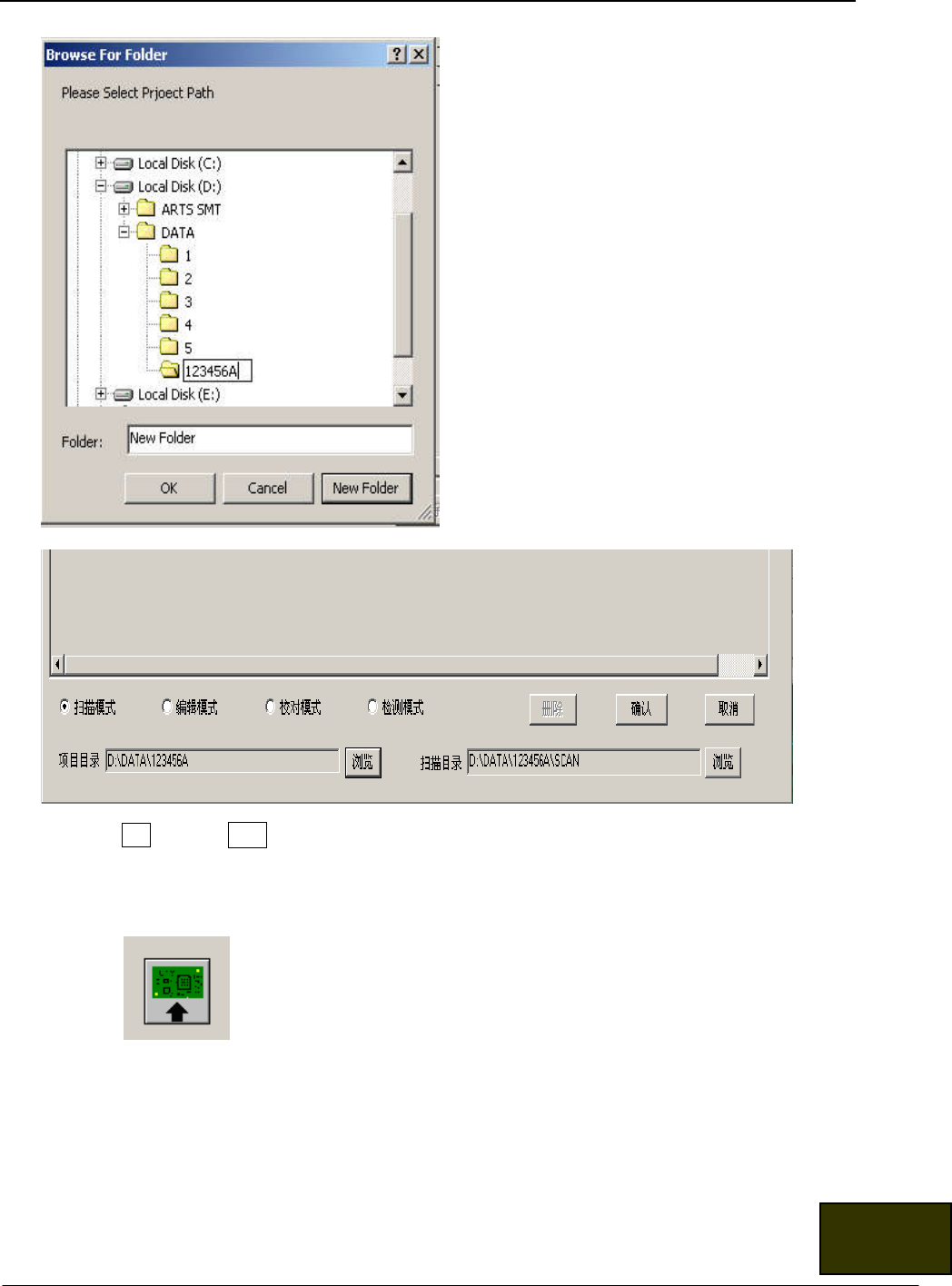 深圳市劲拓自动 化设备有限公司 (培训资料) 第 25 页 共 55 页 , 完 成 后,点击 OK ,再点击 确认 ,系统会自 动在该目录下 创建以下几个文 件夹: BOM( 物料清单 ) 、 CAD( 元件坐标 ) 、 errlog 、 SCAN (此四个文件夹内容介绍在 5 。 1 。 1 章节已作介绍) 4.2.1.4 按此键加载 PCBA , 用鼠标左键 快速双击将 MPSAOI 的画 面中心十字架对 齐 返回目录