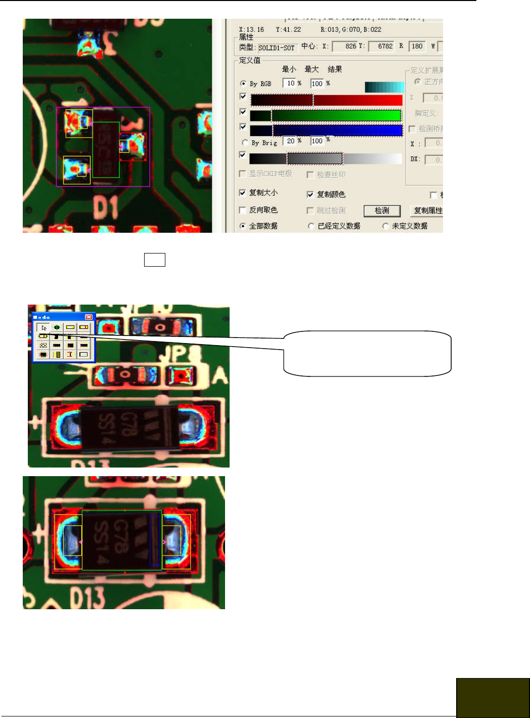 对有极性的元件要注意,在调整好的元件所有的检测内容并检测通过后,要将整个元件检测框旋转