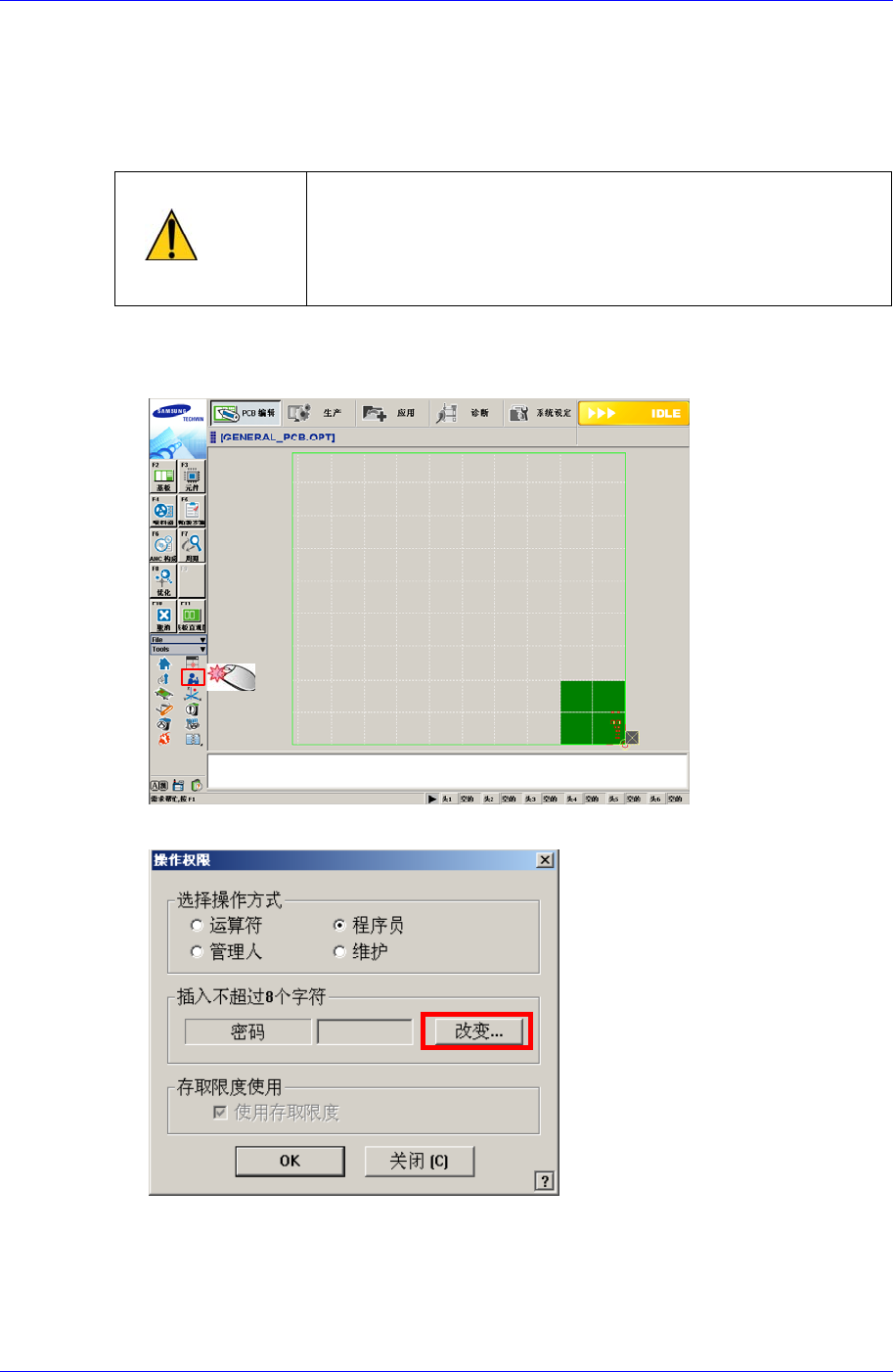 Samsung Component Placer SM41 1 Administrator ’ s Guide 1-8 1.2. 修改密码 除单纯用户方式以外各用户方式具有不同的密码。设置各 用户方式时需要输入密 码。密码必须设置成 8 个字符以内。 注 意 请勿与其他用户共享程序员方式及管理员方式的密码。 无 权限用户在程序员方式或者管理员方式中的错误MMI操作, 可能会导致自身损伤。 请在子菜单点击 ’ 操作方式 ’ 图标按钮 …