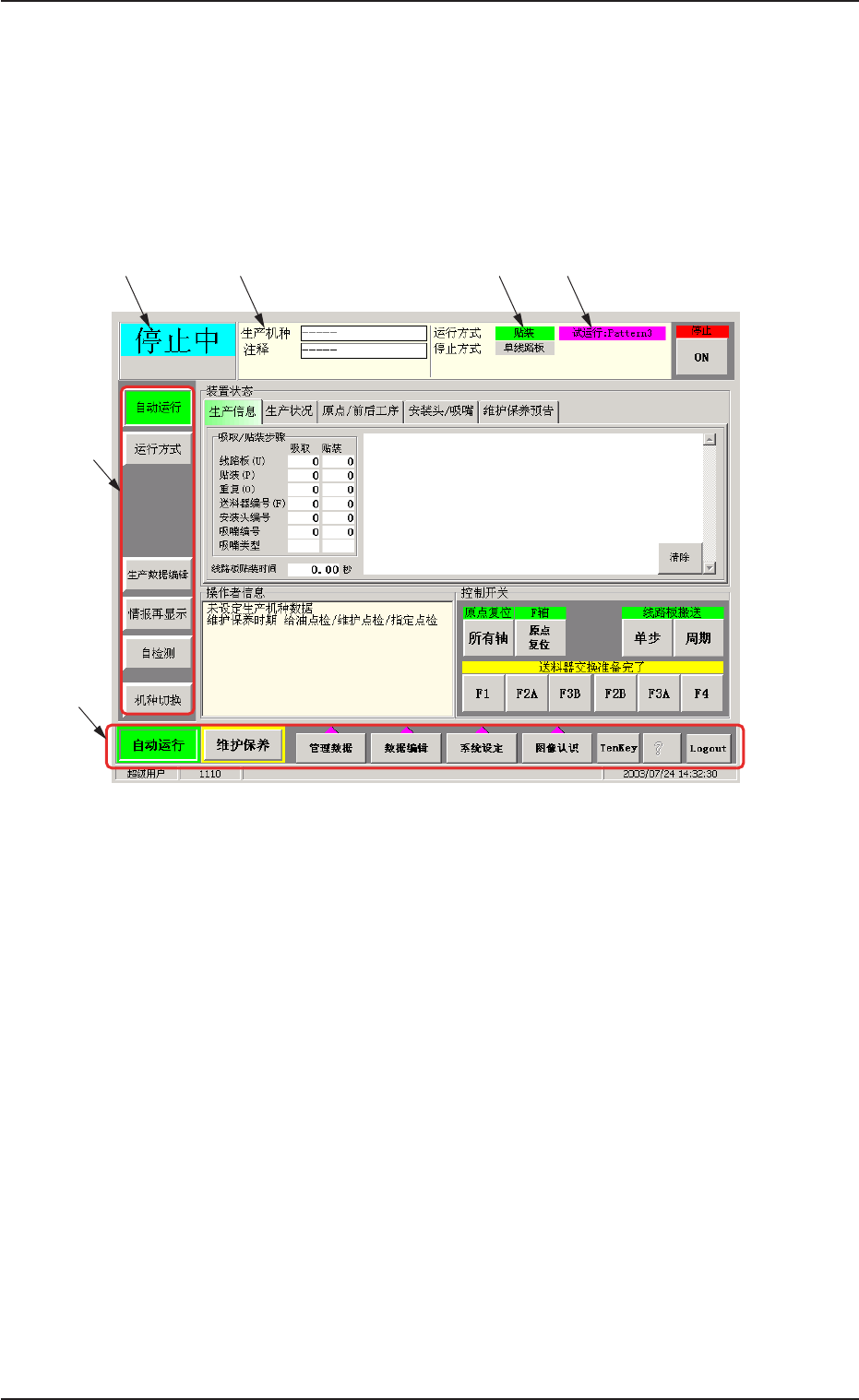 *4 *4 *4 *4 *4 生产机种名、 生产机种名、 生产机种名、 生产机种名、 生产机种名、 注释 注释 注释 注释 注释 生产机种 生产机种 生产机种 生产机种 生产机种 : : : : : 显示有投入自动运行的机种 ( 线路板程序 ) 的名 称。 注 注 注 注 注 释 释 释 释 释 : : : : : 显示有生产机种附带的注释。 *5 *5 *5 *5 *5 运行方式及停止方式 运行方式及停止方式 运行方式及停止方式 运行…