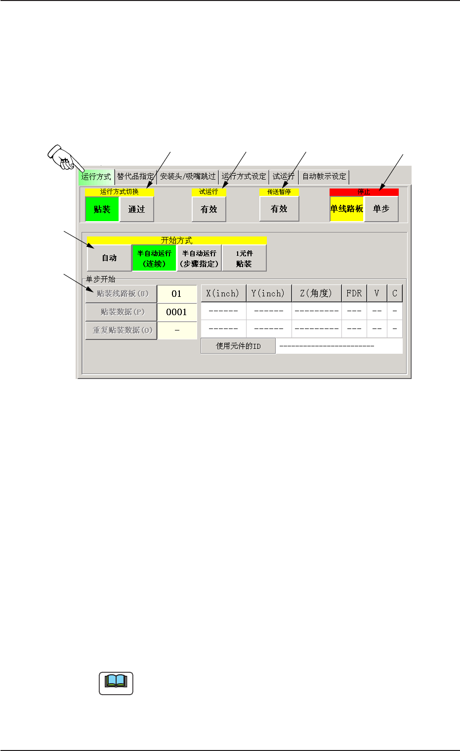 进行运行方式切换、试运行、传送暂停、停止、开始方式等设定。