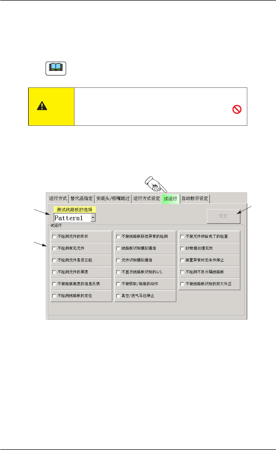 *2 *2 *2 *2 *2 试运行 试运行 试运行 试运行 试运行 选择要实施的试运行方式。 排列有以下多个按钮。 [ [ [ [ [ 不检测元件的形状 不检测元件的形状 不检测元件的形状 不检测元件的形状 不检测元件的形状 ] ] ] ] ] 按钮 按钮 按钮 按钮 按钮 [ [ [ [ [ 不检测有无元件 不检测有无元件 不检测有无元件 不检测有无元件 不检测有无元件 ] ] ] ] ] 按钮 按钮 按钮 按钮 按钮 [ [ [ …