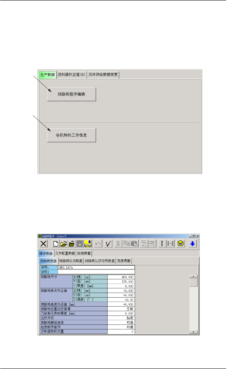 4. 4. 4. 4. 4. “ 生产数据编辑 生产数据编辑 生产数据编辑 生产数据编辑 生产数据编辑 ” 子菜单 子菜单 子菜单 子菜单 子菜单 可进行当前生产机种数据的编辑。并且可变更元件组件。 数据的修正任何时候都可以执行,而与生产运行的状态无 关。 • 页面显示 页面显示 页面显示 页面显示 页面显示 按下自动运行子菜单栏的 [ 生产数据编辑 ] 按钮时,将显示如下子 菜单界面。 Fig.2E30 Fig.2E30 Fig.2E…