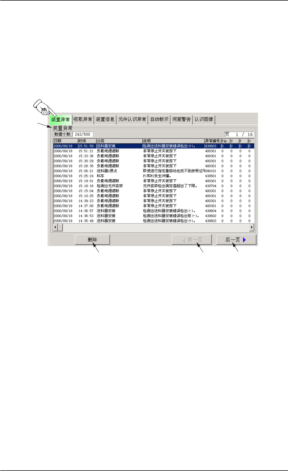 吸取异常 显示发生吸取异常的送料器编号、日期和时间、异常 ID、异