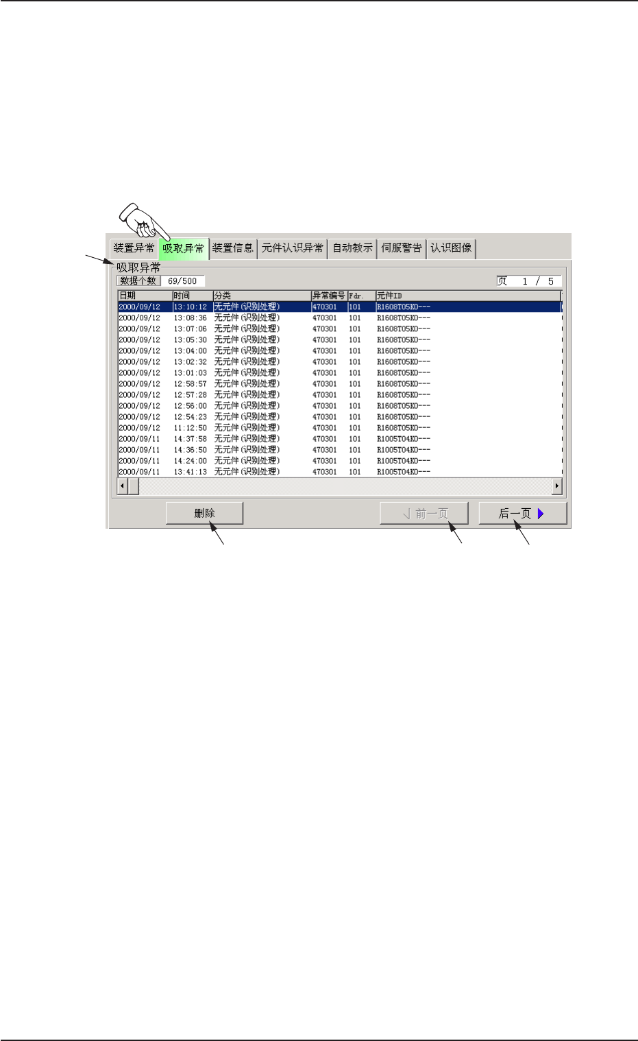 显示发生吸取异常的送料器编号、日期和时间、异常编号、异常内