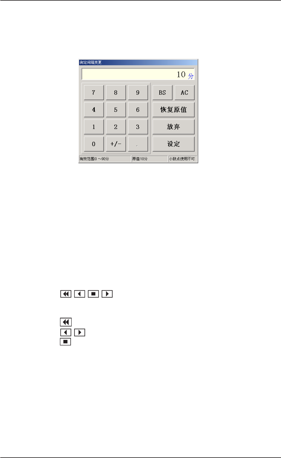 *5 *5 *5 *5 *5 [ [ [ [ [ 测定间隔变更 测定间隔变更 测定间隔变更 测定间隔变更 测定间隔变更 ] ] ] ] ] 按钮 按钮 按钮 按钮 按钮 变更测定时间间隔。 但是,当设定值为 “ 0 ” 时,装置将不做测定。 测定范围 : 0 ~ 90 分 Fig.2E53 Fig.2E53 Fig.2E53 Fig.2E53 Fig.2E53 “ 测定间隔变更 测定间隔变更 测定间隔变更 测定间隔变更 测定间隔变更 ”…