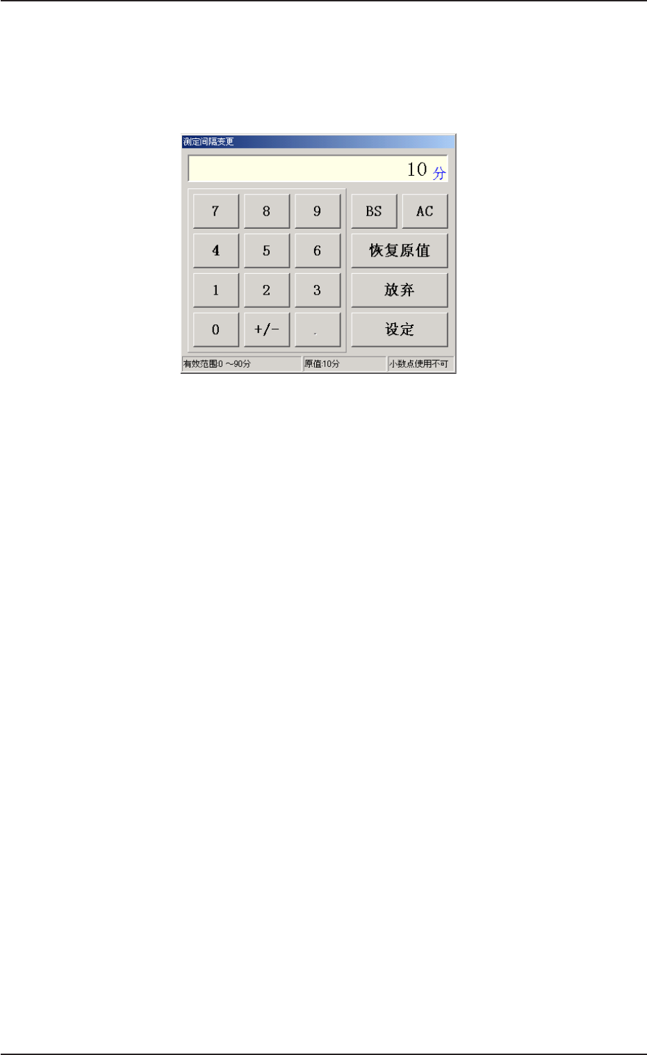 0308-001 5 - 79 *3 *3 *3 *3 *3 [ [ [ [ [ 测定间隔变更 测定间隔变更 测定间隔变更 测定间隔变更 测定间隔变更 ] ] ] ] ] 按钮 按钮 按钮 按钮 按钮 变更测定间隔。 但是,当设定值为 “ 0 ” 时,装置将不做测定。 测定范围 : 0 ~ 90 分 Fig.2E55 Fig.2E55 Fig.2E55 Fig.2E55 Fig.2E55 “ 测定间隔变更 测定间隔变更 测定间隔变更 测…