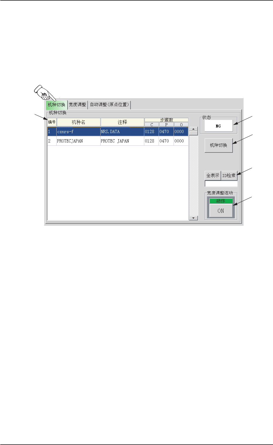 7. 7. 7. 7. 7. “ 机种切换 机种切换 机种切换 机种切换 机种切换 ” 子菜单 子菜单 子菜单 子菜单 子菜单 • 界面显示 界面显示 界面显示 界面显示 界面显示 按下自动运行子菜单栏的 [ 机种切换 ] 按钮时,将显示如下子菜单 界面。 Fig.2E59 Fig.2E59 Fig.2E59 Fig.2E59 Fig.2E59 “ 机种切换 机种切换 机种切换 机种切换 机种切换 ” 子菜单界面 子菜单界面 子菜单界面…