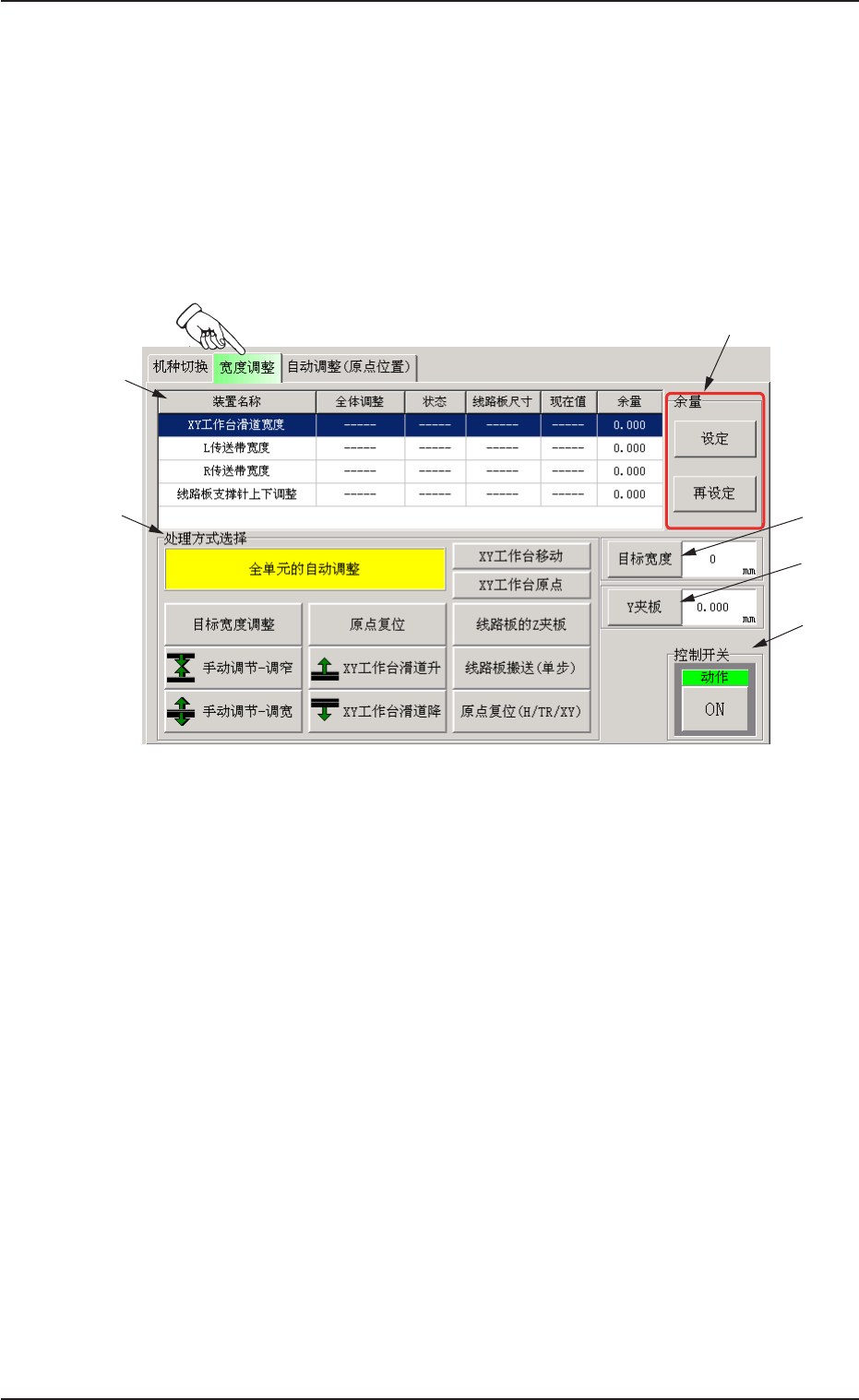 状态 状态 状态 状态 状态 : : : : : 按 *4 *4 *4 *4 *4 的动作 [ON] 按钮,开始做宽度调整, 显示单位状态。 “ 完毕 完毕 完毕 完毕 完毕 ” : : : : : 宽度调整变更完毕,装置在 “ 线路板尺寸 ( 宽 )+ 余量 ” 的位置。 “ 不定 不定 不定 不定 不定 ” : : : : : 装置的位置虽然在 “ 线路板尺寸 ( 宽 )+ 余量 ” , 但非当前位置管理 状态。 “ ----- -…