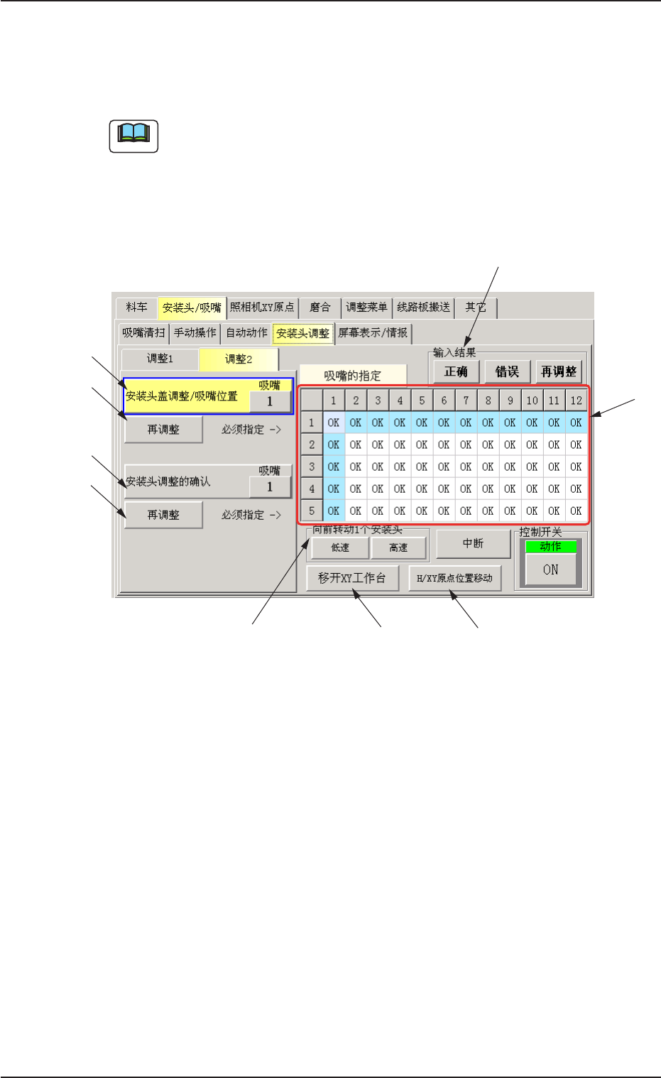 *3 *3 *3 *3 *3 吸嘴切换顺序 吸嘴切换顺序 吸嘴切换顺序 吸嘴切换顺序 吸嘴切换顺序 指定吸嘴切换顺序。 *4 *4 *4 *4 *4 输入结果 输入结果 输入结果 输入结果 输入结果 输入调整确认结果。 [OK] : 调整终了后输入。 [NG] : 未调整时输入。 [ 再调整 ] : 有必要再调整时输入。 界面上显示为 “ Re ” 。 *5 *5 *5 *5 *5 吸嘴的指定 吸嘴的指定 吸嘴的指定 吸嘴的指定 吸嘴的…