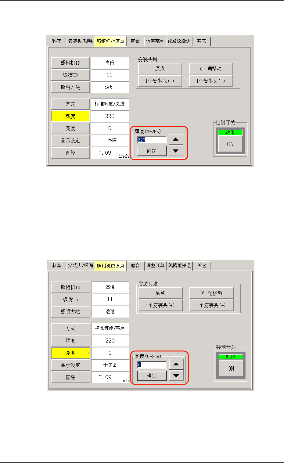 按下[ 标准辉度 / 亮度] 、[ 手动设定] 、[ 各吸嘴照相机] 中的任意一