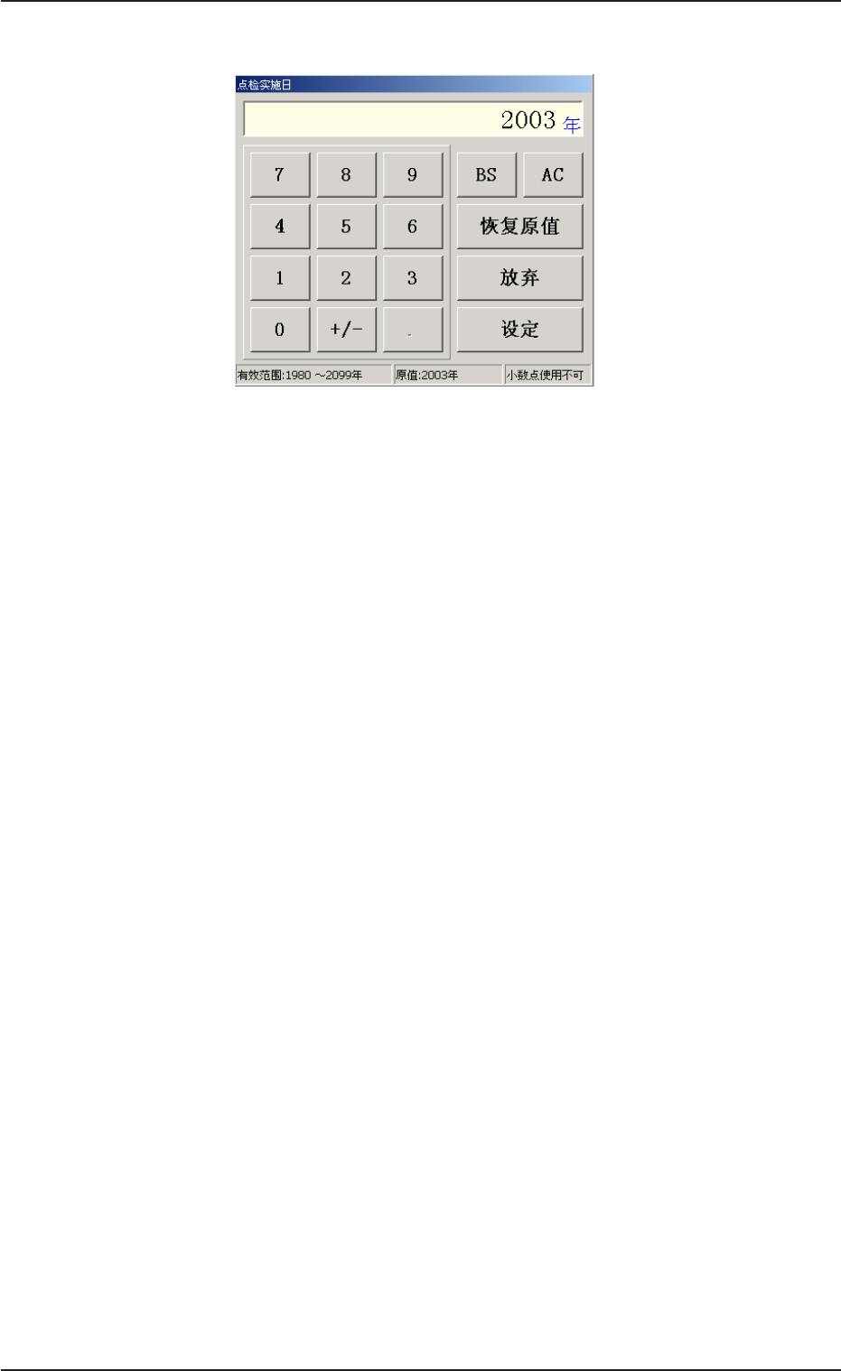 Fig.2F 1 0 1 Fig.2F 1 0 1 Fig.2F 1 0 1 Fig.2F 1 0 1 Fig.2F 1 0 1 “ 点检实施日 点检实施日 点检实施日 点检实施日 点检实施日 ” 编辑界面 编辑界面 编辑界面 编辑界面 编辑界面 (3) 输入实施日期后,按 [ 设定 ] 按钮确认。 *3 *3 *3 *3 *3 点检预告 点检预告 点检预告 点检预告 点检预告 就各个点检周期的实施日期,在 [ 预告 ] 和 [ 不预告…