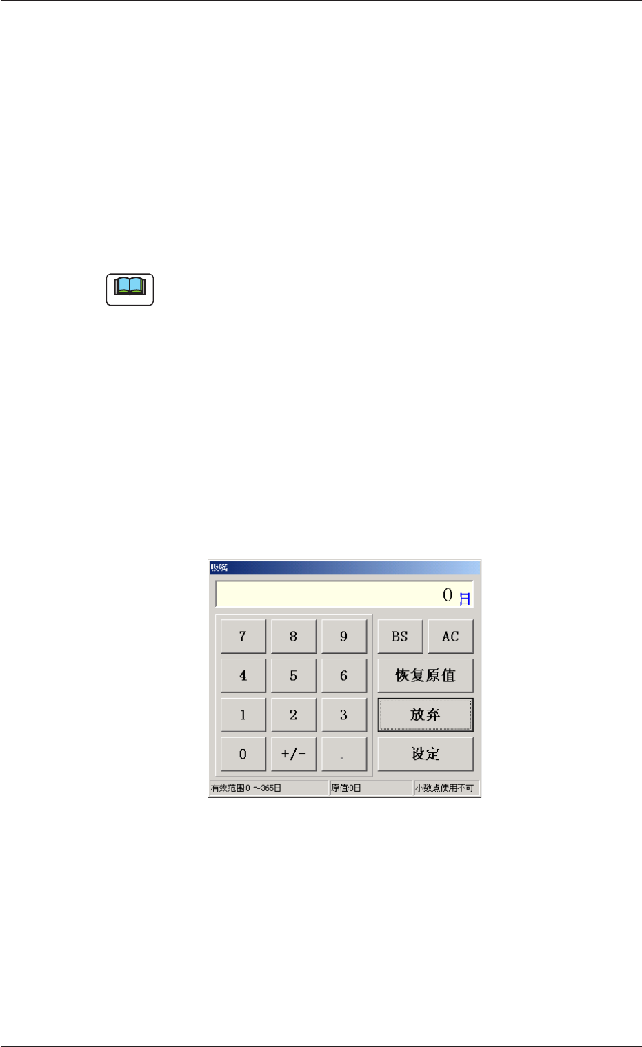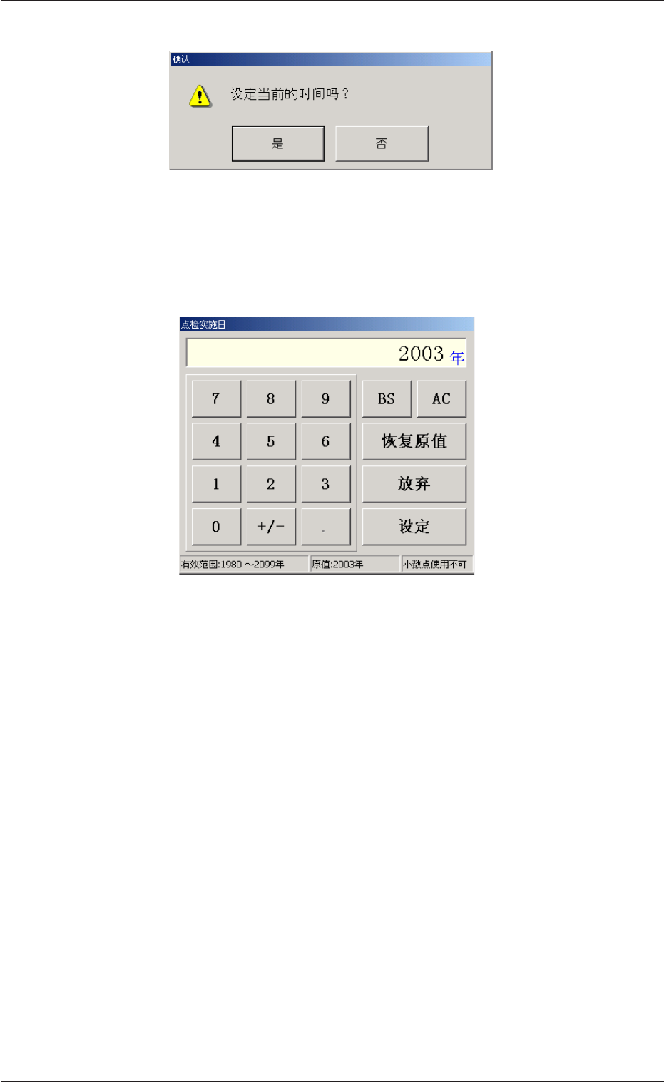 Fig.2F 1 03 Fig.2F 1 03 Fig.2F 1 03 Fig.2F 1 03 Fig.2F 1 03 “ 实施日期设定确认 实施日期设定确认 实施日期设定确认 实施日期设定确认 实施日期设定确认 ” 对话框 对话框 对话框 对话框 对话框 (2) 要将实施日期设定为当前日期时刻时,按 [ 是 ] 。 要将实施日期设定为当前日期时刻以外的时间时,按 [ 否 ] , 跳出如下 “ 点检实施日 ” 编辑界面。 Fig.2F …
