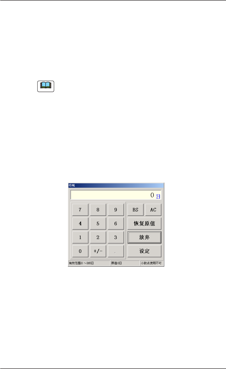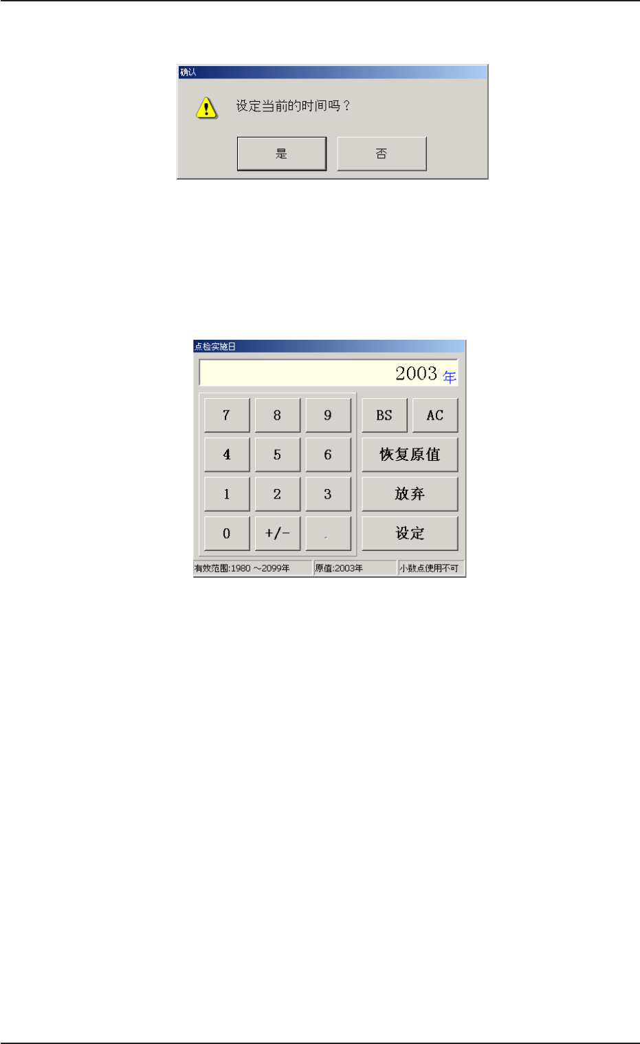 Fig.2F107 Fig.2F107 Fig.2F107 Fig.2F107 Fig.2F107 “ 点检实施日设定确认 点检实施日设定确认 点检实施日设定确认 点检实施日设定确认 点检实施日设定确认 ” 对话框 对话框 对话框 对话框 对话框 (2) 要将实施日期设定为当前日期时刻时,按 [ 是 ] 。 要将实施日期设定为当前日期时刻以外的时间时,按 [ 否 ] , 跳出如下 “ 点检实施日 ” 编辑界面。 Fig.2F108 Fi…