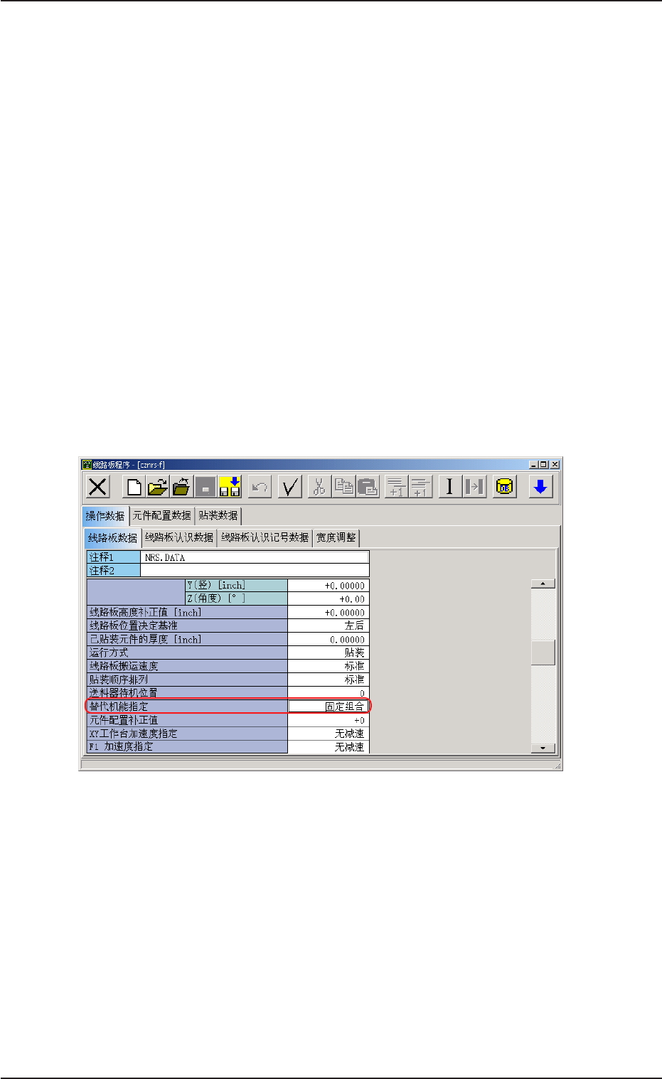 (1) 在线路板程序编辑界面的 “ 操作数据 ” 选项卡中,将 “ 替代机能