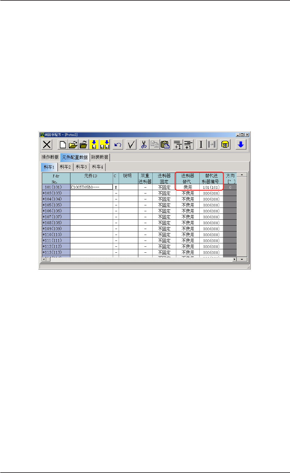 • 原来的送料器编号( 元件配置数据) 的 C(控制指令) 数据被设定为