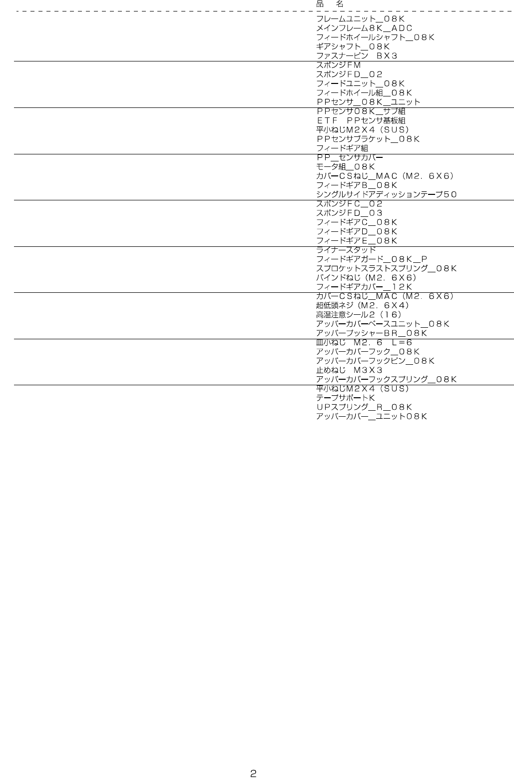 - - REF.NO NOTE PARTNO DESCRIPTION Qty 1 401-69516 FRAME_UNIT_08K 1 2 401-71152 MAIN_FRAME_8K_ADC (1) 3 401-67228 FEED_WHEEL_SH_08K (1) 4 401-67216 GEAR_SH_08K (6) 5 E6347-705-000 FASTENERPINBX3 (1) …